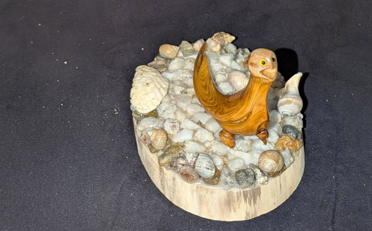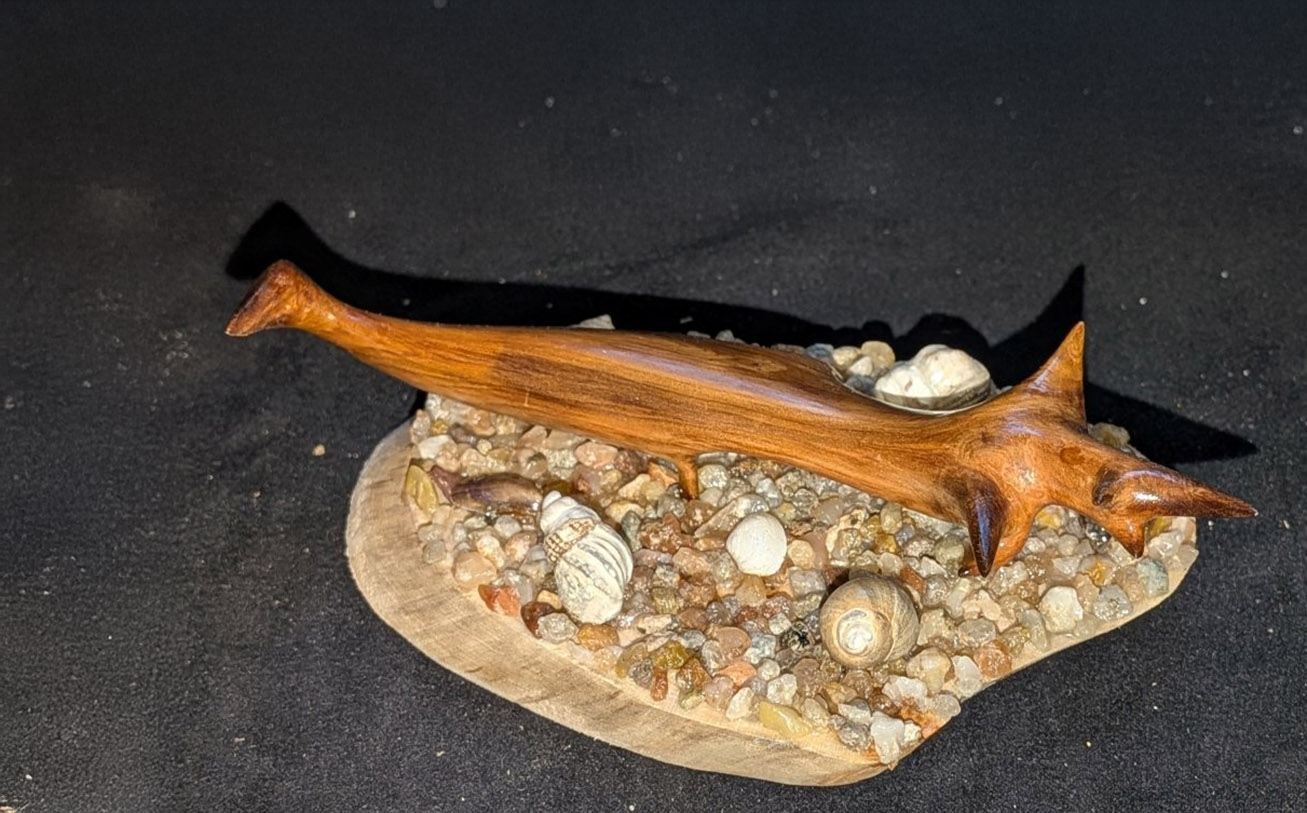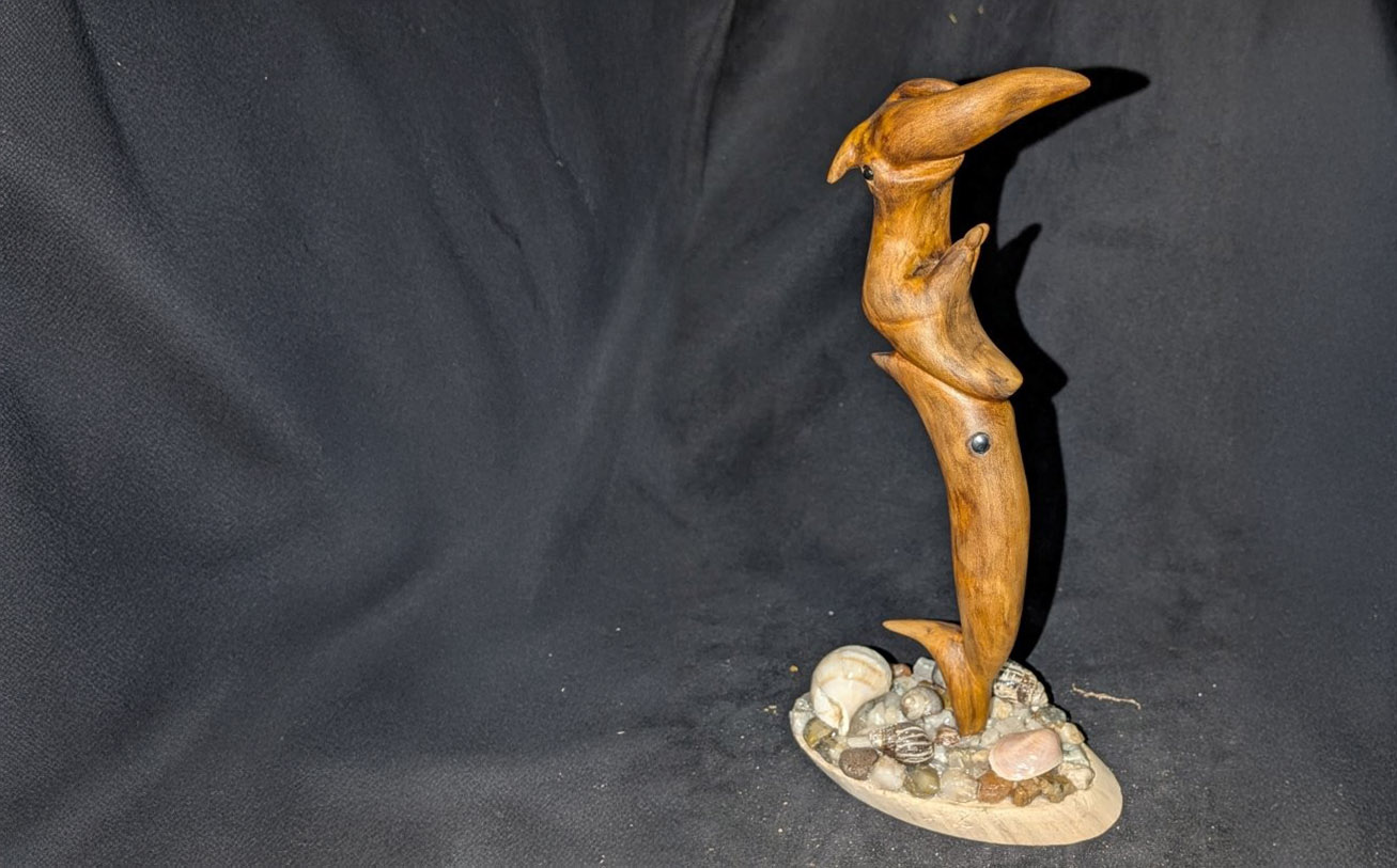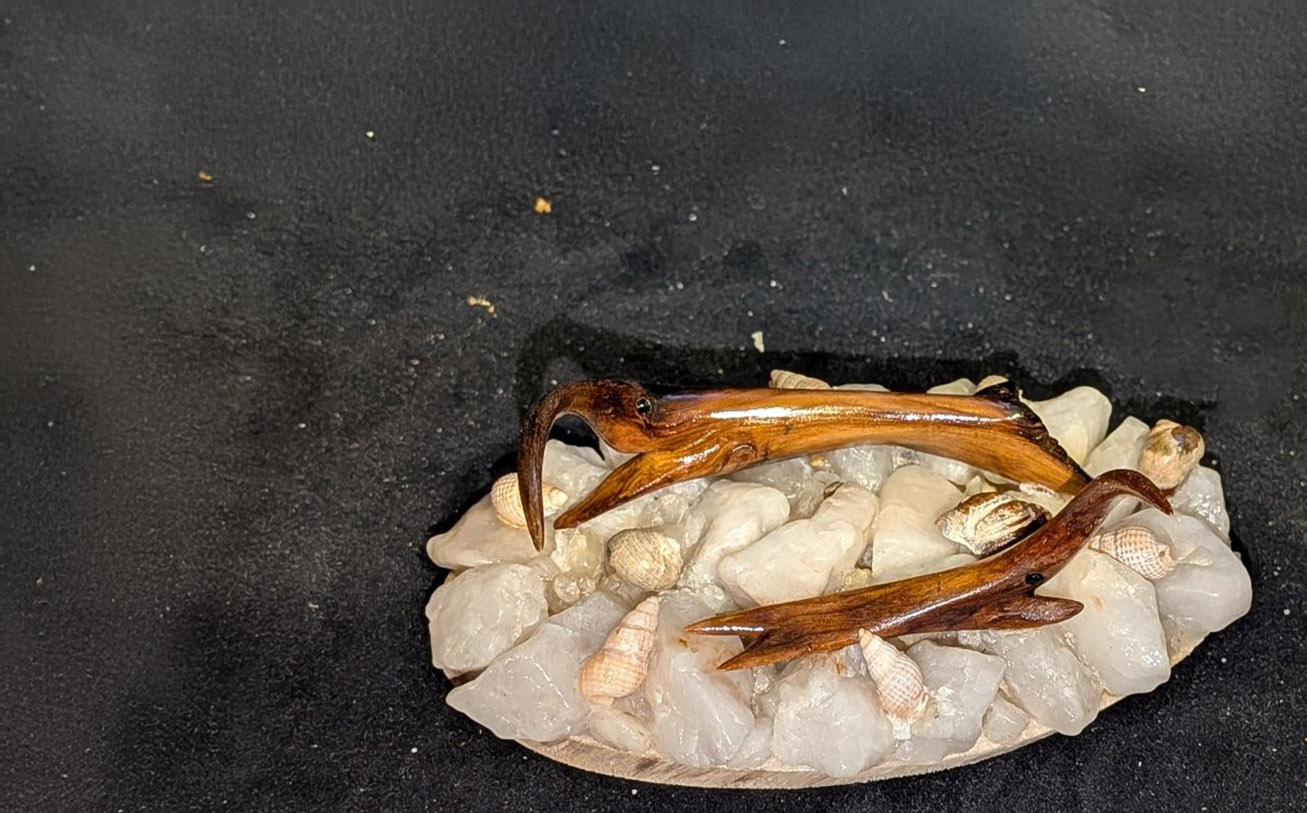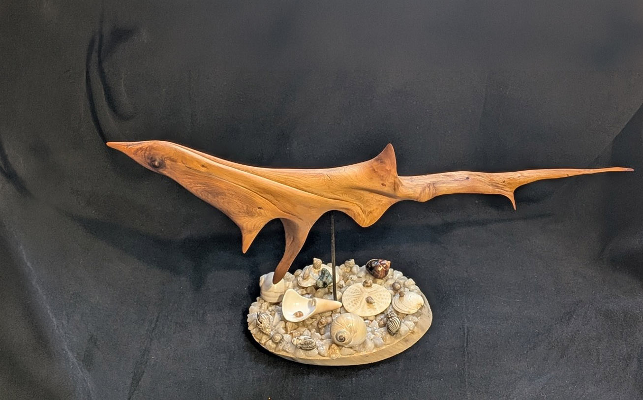 One of his most notable creations is a detailed shark sculpture — his first fully completed piece — which he began in 2020 and finished in 2023 after dedicating approximately 650 hours. “Making the jaw was the hardest part,” he says. “Then I had to figure out the base. Since the wood came from the sea, I added rocks and shells from the ocean — it just made sense.”
