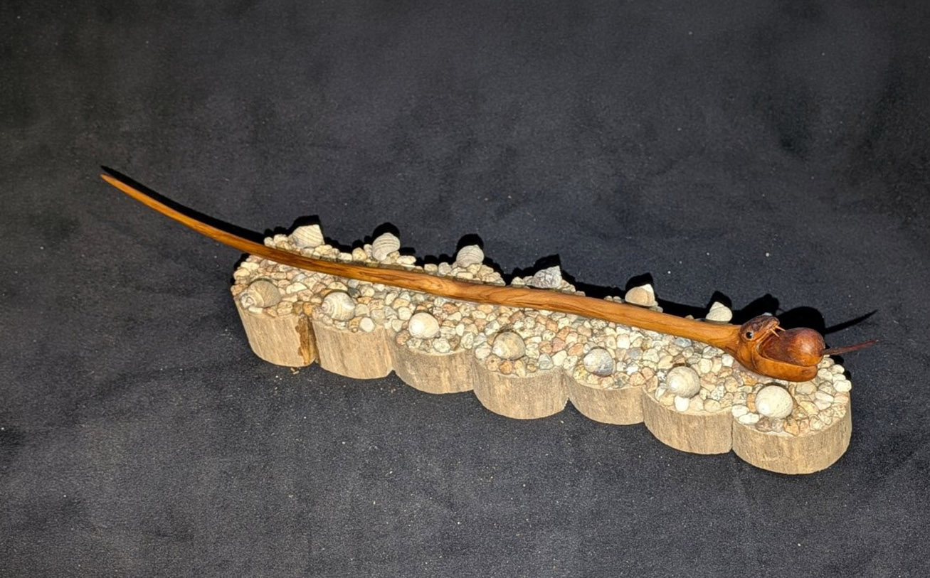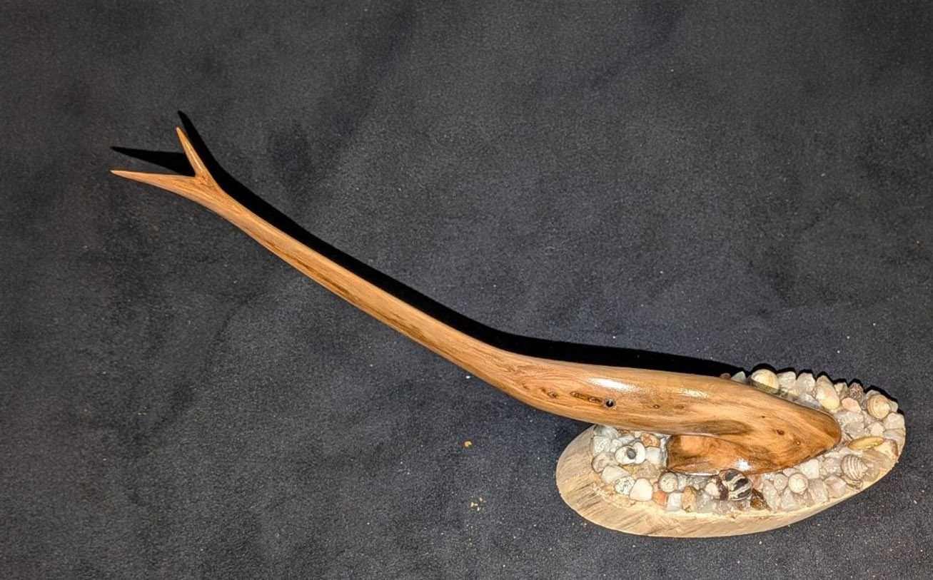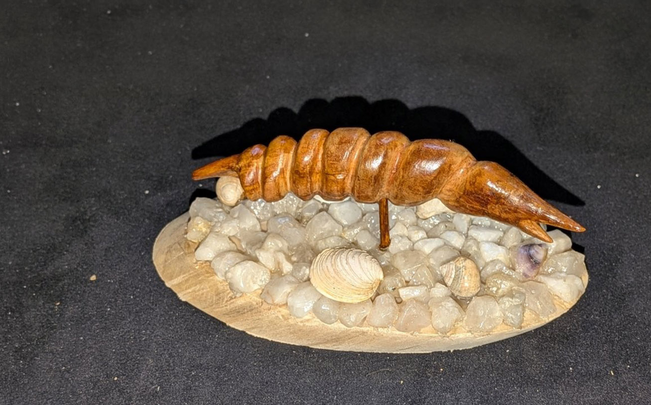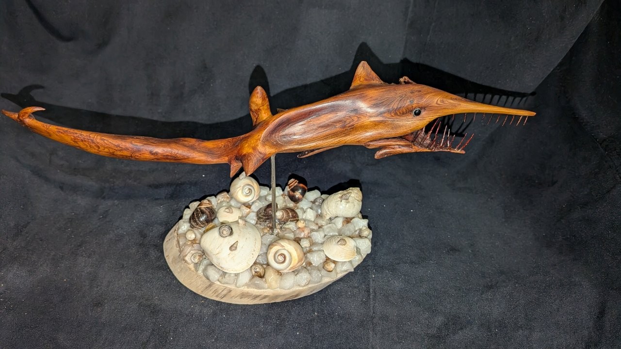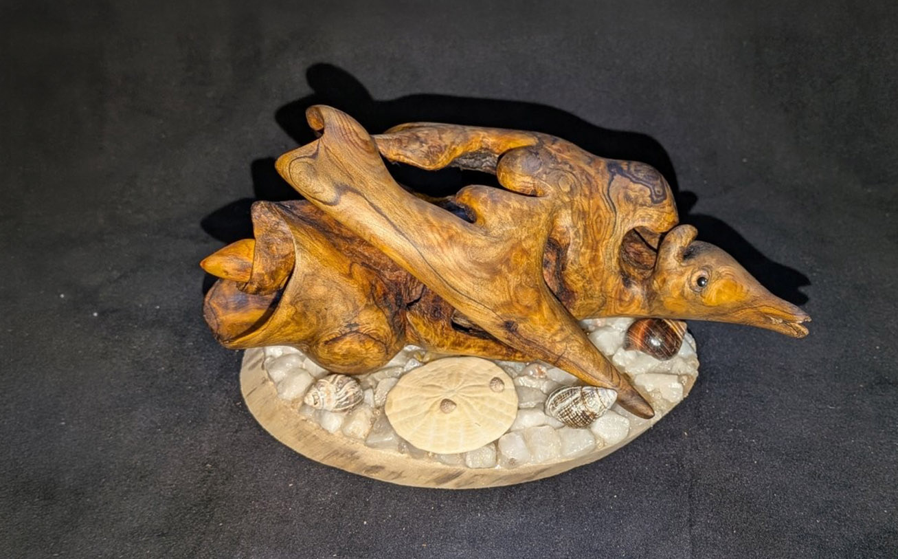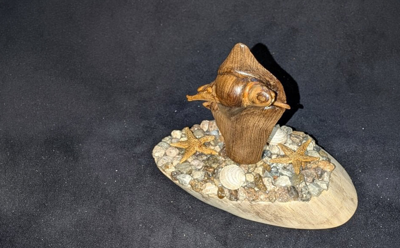 One of his most notable creations is a detailed shark sculpture — his first fully completed piece — which he began in 2020 and finished in 2023 after dedicating approximately 650 hours. “Making the jaw was the hardest part,” he says. “Then I had to figure out the base. Since the wood came from the sea, I added rocks and shells from the ocean — it just made sense.”