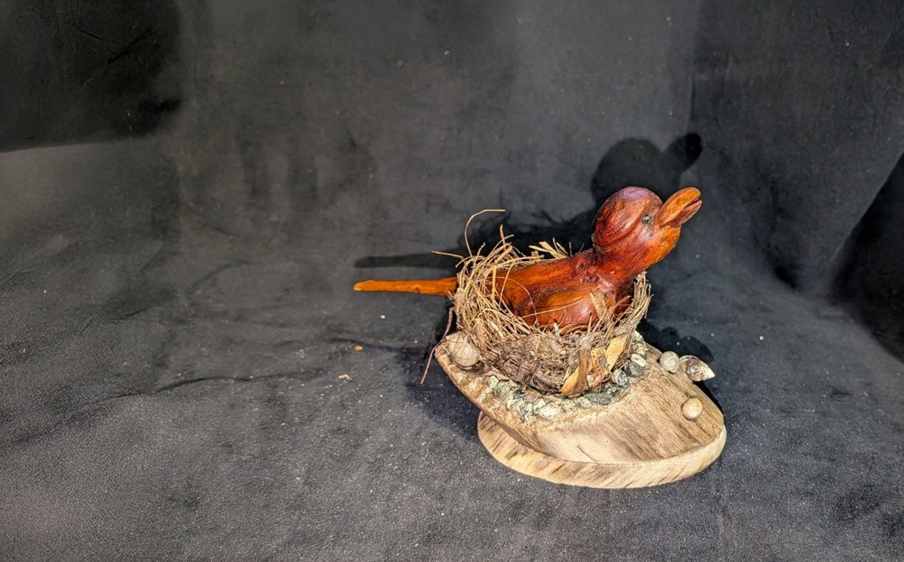 He began collecting driftwood along the Miramichi shoreline around 2007 and started carving a few years later, in 2010. Guided by instinct and curiosity, his process is both patient and exploratory. “I start by playing around with the pieces,” Allain explains. “I’ll work on one for a while, set it aside, and move on to the next.”